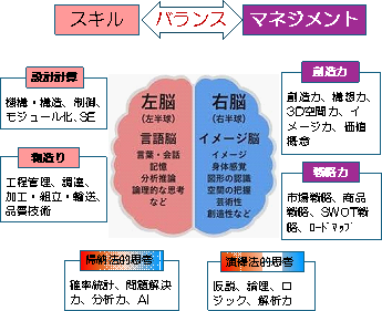 生産活動は、ものづくりのコアーとなる『固有技術(スキル)』とその周辺にある戦略・創造および解析技術などの『管理技術(マネジメント)』とから成り立つ。「固有技術」は規格化され手順が公開されることで共有化されやすいが「管理技術」は目に見えにくく、ものづくりのスピードはここで差がつくことが多い。また、固有技術は繰り返し反芻性や計算力など左脳に依存することが多いが、管理技術に含まれる「創造力」や「戦略力」は白紙のキャンパスに絵を描くような構成力とイメージ創出力が必要で右脳の活発な働きが要求される。