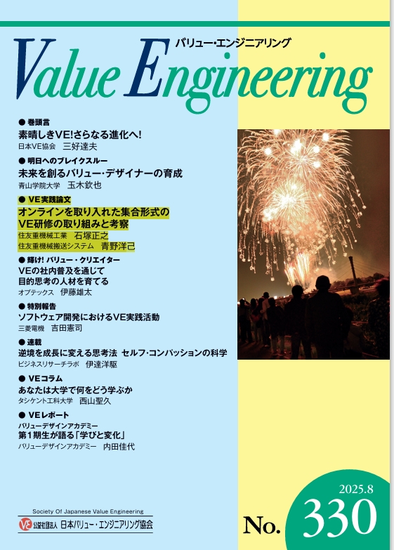 | 2025年08月01日:VE誌論文投稿 [オンラインを取り入れた集合形式のVE研修の取り組みと考察」を投稿。 特別なVEテクニカル論があるわけではないが実直に取り組んでいる様子を整理しただけです。しかし今日これほどの規模で社内研修を継続しているところはあまりなさそうである。 継続は力なり! 2022年03月14日:活き活きVE研究会初参加 事例研究発表と質疑、その後リモート飲み会の構成。 お久しぶりな諸先輩方もいく人か居られ楽しくも有意義な場でした。 2022年2月3-4日:VE実践セミナー(リモート・オンライン方式) 200名の応募を受け2回に分けて開催。Teamsによるオンライン方式 で、一人VEを基本としながらもブレークアウトルーム機能を織り込み 情報交換の場を設け相互のチームワークを疑似体験する構成とした。 2019年4月〜8月:大阪HT社/若手技術者VE教育指導終了 実課題を題材に半日8回でワークショップを実体験。 第43回VE全国大会('10年10月26-27日) ◇特別講演「ボリュームゾーン戦略」(中国市場攻略)東京大学社会科学研究所丸川教授...印象に残ったキーワード”陰徳” 〜”陰徳の排除”....客先には見えない部分の難燃性材料の使用や無用な磨き上げの労力などは、アピールポイントに換えて表現しないと意味がない。一方、ありすぎるアピールポイントは競争力を低下させる。 第38回VE全国大会開催(’05年9月7-9日) ◇7日:「産業技術館」トヨタの物作りの歴史を実物とともに展示 〜豊田自動織機時代の織機の技術発展を細かく実機で再現。綿花が糸に紡がれていくメカニズムを細かくわかりやすく解説・実演してくれるが、物作りへの拘りをここにも窺い知る事ができる。 ◇8日 @基調講演「トヨタのモノづくり・人づくり」/池渕相談役 〜池渕相談役の話しは2回目だが、改めて徹底した”現地・現物主義”と何事も”愚直に継続”することの重要性を確認。 A記念講演「競争力ある空港を目指すセントレア」/平野代表取締役社長(平野社長は前関東自動車社長) 〜特にセントレアでの約1000億円のコスト節減は圧巻。 トヨタの原点は”ハングリー”にあり、これだけの巨大企業になってもその精神はなにも変わっていない。感動すら感じる。 B特別講演:「”グローバルワン企業”を目指すモノづくり戦略」/叶X精機製作所 森取締役社長 〜需要の山谷に苦慮、自動倉庫とAGVを撤廃し仕込生産方式からセル生産方式に切替業績回復、今やグローバル企業に成長。スケールの大きいマーケットの読み方から現場の生産形態に至る一連の経営戦略の高さに学ぶところが多い。 シックスシグマとVE...一見「油と水」の関係のように思われるかもしれませんが、この連携は戦略上重要だ。補完し合うことによる新たなジャンル構築の予感さえする。